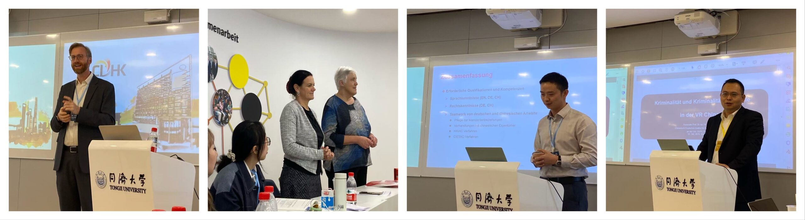Einen weiteren Höhepunkt des Nachmittags bildete der Vortrag des Alumnus Zhong Yuan, heute Partner der Kanzlei Shaohe Law Firm in Shanghai. In seinem Beitrag sprach er über die Anwendung deutschen Rechts in der chinesischen Rechtsberatung und berichtete aus seiner beruflichen Praxis sowie von seinen Erfahrungen im gemeinsamen Doppelmasterprogramm an der Tongji-Universität. Sein lebendiges Fallbeispiel machte deutlich, wie Absolventinnen und Absolventen der deutsch-chinesischen Studienprogramme in Wirtschaft und Recht heute erfolgreich grenzüberschreitend tätig sind und so das akademische Netzwerk mit Leben erfüllen. Anschließend folgten wissenschaftliche Vorträge aus den beteiligten Instituten: Prof. Xu Lingbo (Nanjing) sprach über Probleme der Vorsätzlichkeit in der Strafrechtsprüfung, Prof. Huang He (CUPL) widmete sich dem Thema Kriminalität und Kriminalitätskontrolle in China, während Prof. Zhang Taolüe (Tongji) den nächsten Programmpunkten aufgrund zeitlicher Begrenzungen den Vorzug gewährte.
