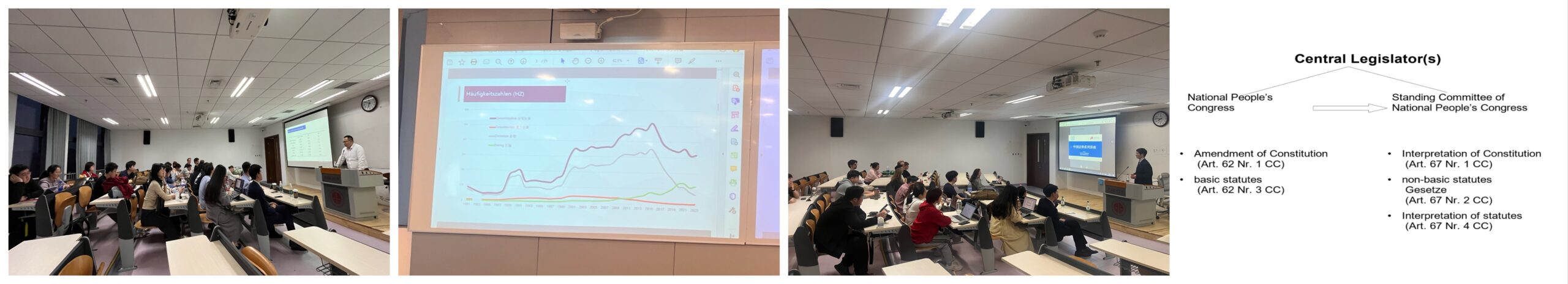 Die zweite Vorlesung am 17. April 2026 wurde von Dekan Xie Libin gehalten und widmete sich dem chinesischen Verfassungsrecht. Der Vortrag bot einen umfassenden Überblick über die Entwicklung der chinesischen Verfassung, die Struktur der Staatsorgane sowie zentrale verfassungsrechtliche Grundentscheidungen. Dabei wurden auch vergleichende Bezüge zu westlichen Verfassungstraditionen hergestellt, um unterschiedliche rechtliche und politische Grundannahmen nachvollziehbar zu machen. Die Darstellung zeichnete sich durch eine informative und differenzierte Herangehensweise aus, die neben der systematischen Vermittlung auch Raum für Einordnung und Reflexion ließ.